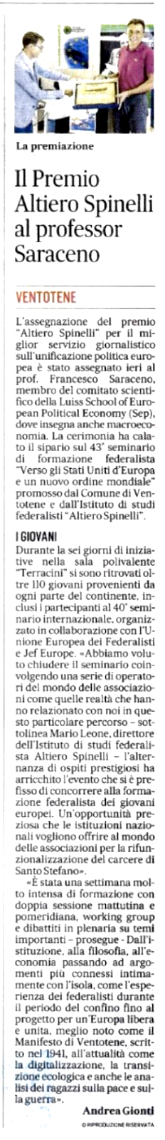 Al termine è stato proclamato e poi consegnato il Premio giornalistico “Altiero Spinelli” al prof. Francesco Saraceno dell’università LUISS di Roma e docente a Sciences Po di Parigi editorialista de Il Sole 24 ore e di Domani.