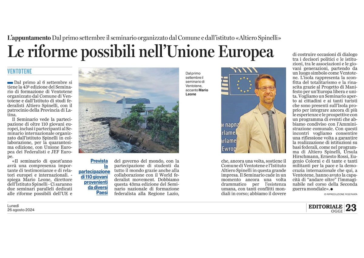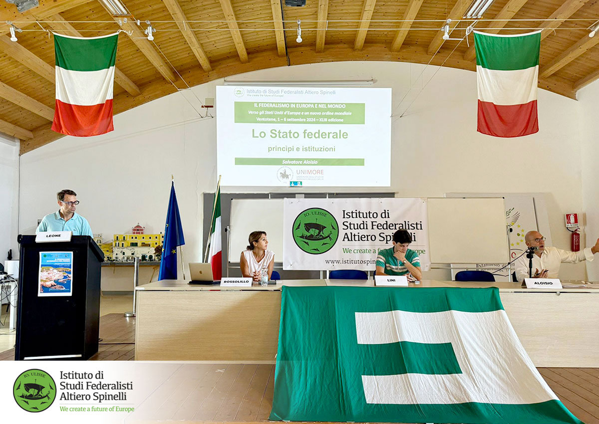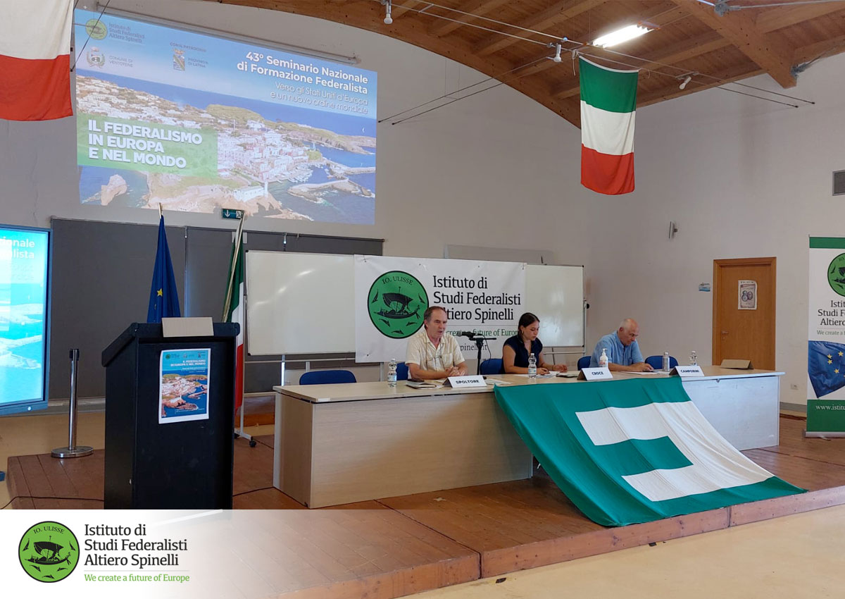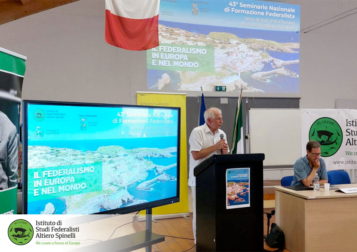 Il seminario di formazione federalista europea, organizzato dall’Istituto di Studi Federalisti “Altiero Spinelli”, costituito nel 1987, nella sede della Giunta Regionale del Lazio, per concorrere alla formazione federalista dei gio­vani europei e per approfondire e rilanciare le tematiche che caratterizzarono la vita politica e culturale di Altiero Spinelli, e dal Comune di Ventotene, grazie al supporto della Regione Lazio, si è aperto alle ore 17 del 1° settembre con l’evento inaugurale dal titolo “Verso gli Stati Uniti d’Europa e un nuovo ordine mondiale”.