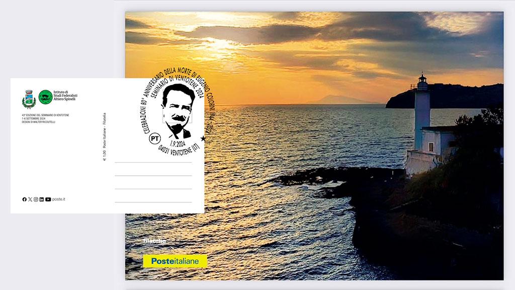 Infine, un annullo filatelico speciale dedicato all’80° anniversario della morte di Eugenio Colorni, con una nuova cartolina celebrativa per le 43° edizione del seminario nazionale, grazie all’iniziativa congiunta di Poste italiane spa e Istituto Spinelli.