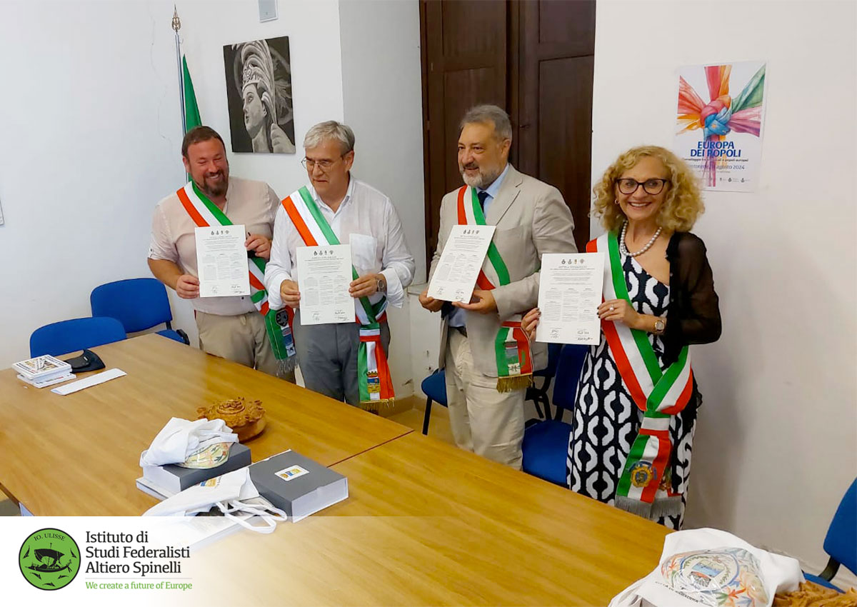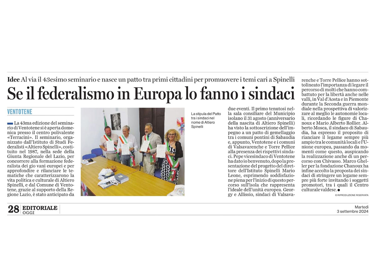 Il seminario è stato anticipato da due eventi. Il primo tenutosi nella sala consiliare del Municipio isolano il 31 agosto (anniversario della nascita di Altiero Spinelli) ha visto la sottoscrizione dell’impegno a un patto di gemellaggio tra i comuni pontini di Sabaudia e, appunto, Ventotene e i comuni di Valsavarenche e Torre Pellice alla presenza dei rispettivi sindaci. Pepe vicesindaco di Ventotene ha dato il benvenuto, dopo la presentazione del progetto del direttore dell’Istituto Spinelli Mario Leone, esprimendo soddisfazione piena per l’inizio di questo percorso sull’isola che rappresenta l’ideale dell’unità europea.  Georgy e Allissio, sindaci di Valsavarenche e Torre Pellice hanno sottolineato l’importanza di legare il percorso di molti che hanno combattuto per la libertà anche nelle valli, in Val d’Aosta e in Piemonte durante la Seconda guerra mondiale nella prospettiva di valorizzare al meglio le autonomie locali, ricordando le figure di Chanoux e Mario Alberto Rollier. Mosca, sindaco di Sabaudia, ha espresso il proposito di rianciare il legame sempre più ampio tra le comunità locali e l’Unione europea, passando da momenti come questo, auspicando la realizzazione anche di un percorso con Chivasso. Marco Gheller per la fondazione Chanoux ha infine accolto la proposta dei sindaci di stringere un legame sempre più forte invitando i soggetti promotori, tra i quali il Centro culturale valdese.
