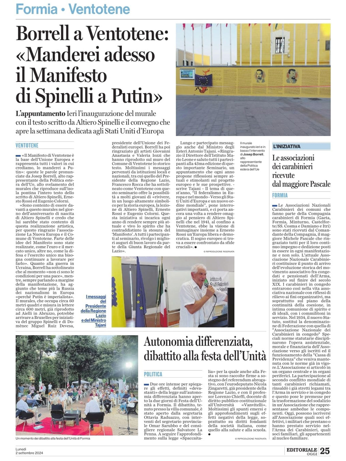 Dopo gli inni nazionale e europeo della banda di Ventotene il seminario si è aperto il seminario con gli interventi della Prefetto di Latina Ciaramella, del presidente della Provincia di Latina Stefanelli e del vicesindaco di Ventotene Pepe. Gli interventi sono stati intervallati dalla lettura dei messaggi giunti dal vicepresidente del consiglio Tajani e dal presidente della Regione Lazio. Le conclusioni sono state affidate a Panizzi vicepresidente dell’Istituto Spinelli e al presidente Castagnoli. Tutti gli interventi hanno sottolineato la necessità di approfondire la presenza italiana nel processo di integrazione europea e che si apra una stagione di riforme per rendere l’Unione più efficiente. Nel secondo panel è intervenuto il vicepresidente della Commissione europea Josep Borrell che nel suo ruolo di Alto rappresentante per gli affari esteri UE ha voluto lanciare un messaggio in difesa della pace: come è impossibile pensare a una guerra in Europa così i nostri giovani devo poterlo auspicare per il mondo intero, proprio a Ventotene simbolo dell’unità, da dove è partito il messaggio per una pace nel nostro Continente. Successivamente sono intervenuti Domenec Devesa, già Parlamentare europeo, autore della risoluzione che ha individuato in Ventotene la Capitale morale d’Europa, e Guy Verhofstadt, anche lui Parlamentare uscente, già ex presidente del consiglio belga; ambedue hanno sottolineato come l’unità dell’Europa deve essere federale richiamando la responsabilità delle istituzioni ad affrontare con vigore le riforme necessarie. Ultima tranche di interventi di Nikolaos Farantouris e Thijs Reuten, parlamentari europei in carica e membri del Gruppo Spinelli. Due relazioni Philippe Laurette Presi­dente dell’Associazione Jean Monnet, Klaus Welle già Segretario generale del Parla­mento europeo, presidente del consiglio accademico del Centro Martens per gli studi europei.